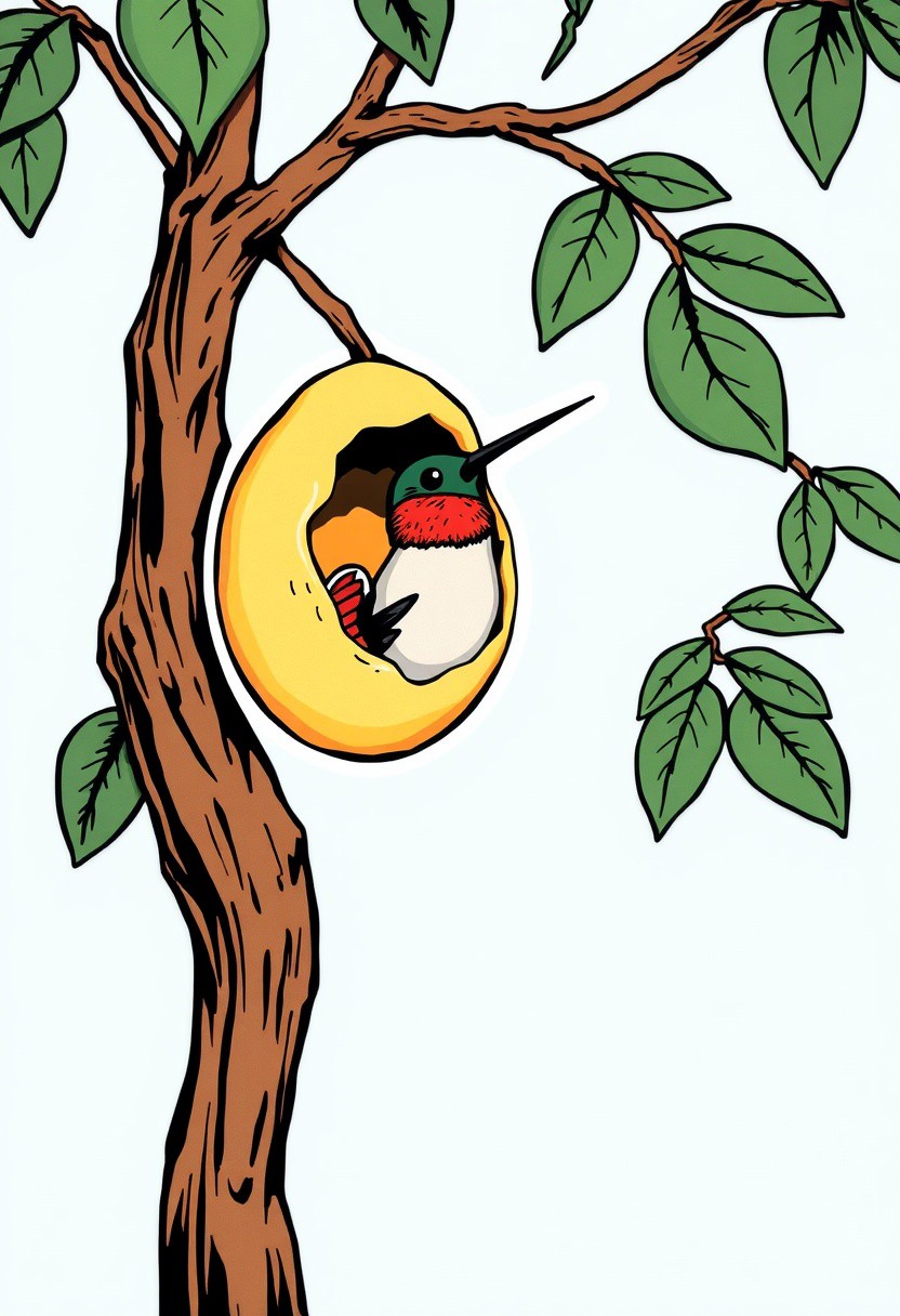 A striking sticker on a pale blue background, ready for cutting. The sticker depicting a small hummingbird emerging from its egg in a tree. The illustration is in a dynamic manga style with bold outlines and vibrant, high-contrast colors.