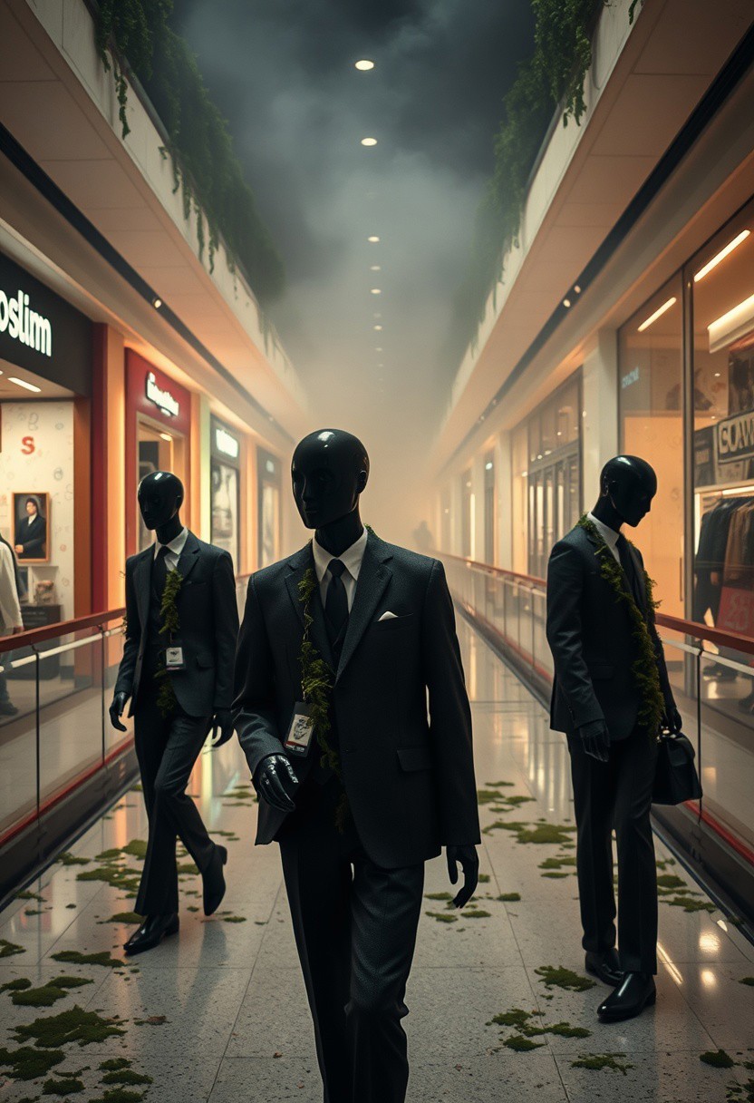 faceless mannequins wearing suits are wondering in shopping mall that is covered with moss and spore, masterpiece, dim light, fog, ambient mood, perfect composition, abstract glitch, long shot, sfw