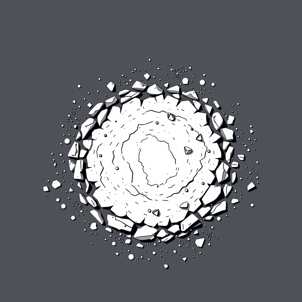 a overhead view of a piece of flat dirt, in a black and white lineart style as a tile from a video game tileset, viewed directly from overhead, flat 2D minimalist style, black and white monochrome color pallete, (stylized 2D, vector art), (sqaure 2D tile design), (solid colors, thick-linework), white outline, black background, HDR, UHD, overall design is square, minimalist,