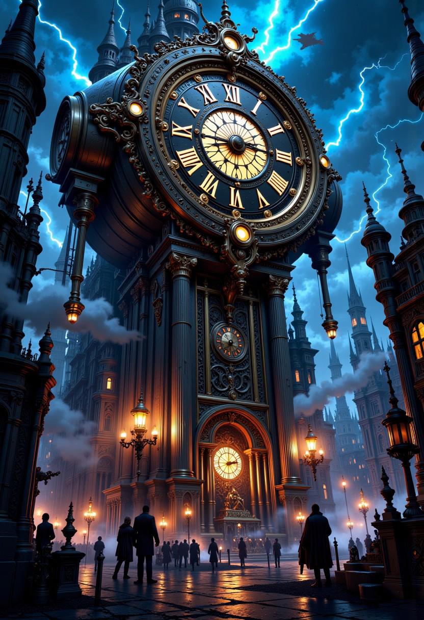 mythp0rt, A massive, intricately designed steampunk, clock with a gothic metal frame, its numbers 1 through 12 glowing faintly with an otherworldly energy. The razor-sharp hands tick with ominous precision, gears grinding beneath its surface. It looms over a sprawling steampunk metropolis—a city of towering brass spires, airships drifting between copper skyscrapers, and piston-powered bridges shifting above the smog-choked streets. Below, inventors, rogues, and revolutionaries move through alleys lit by flickering gas lamps. Overhead, arcs of blue electricity crackle in the storm, hinting at dangerous experiments deep within the city. The clock stands as both a guardian and a warning—time is running out.