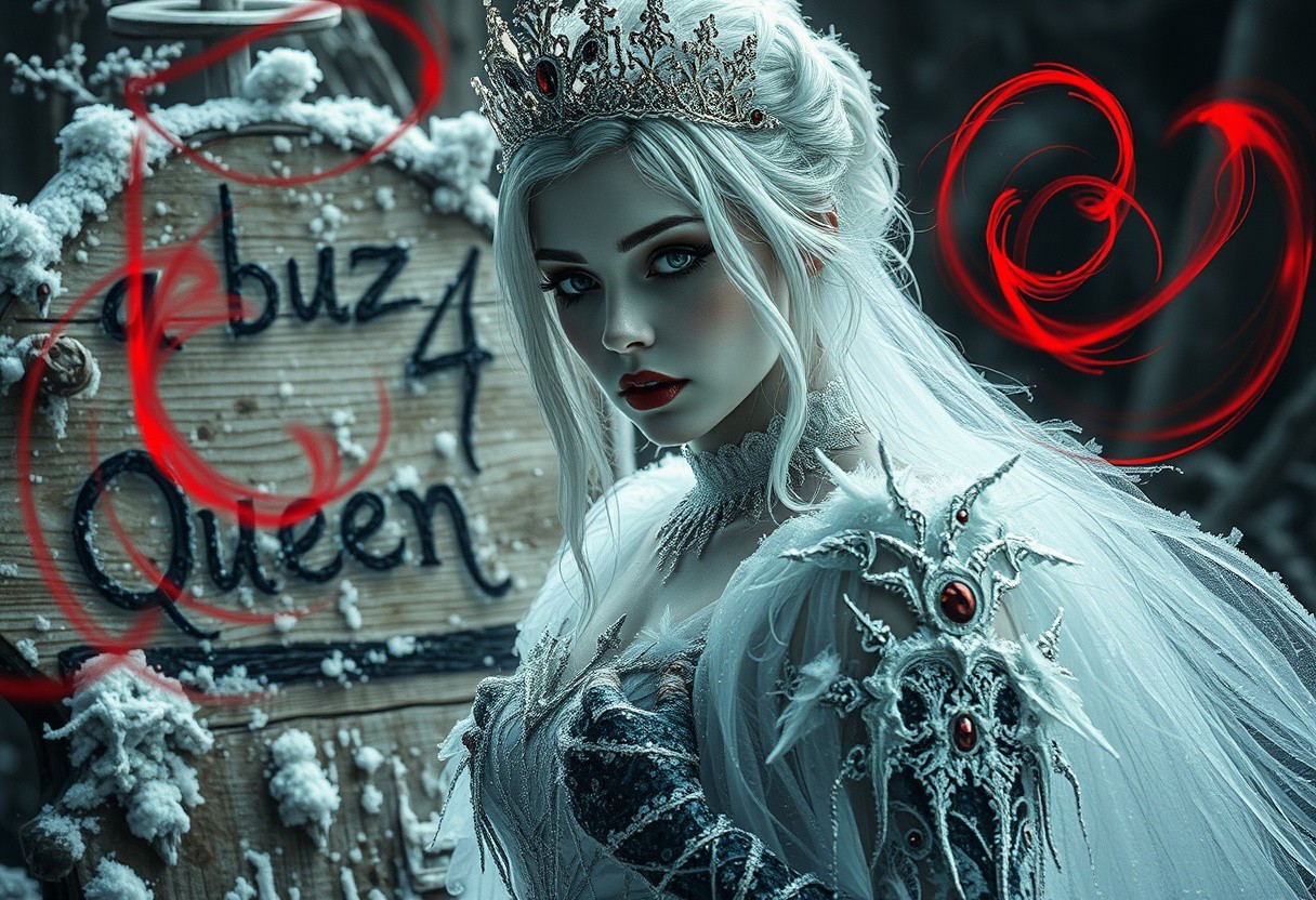 “A hyperrealistic depiction of an ice princess with an eerie ambiance, wearing heavy gothic makeup, set in a rotten and decayed world. The scene is intricate with frost-covered elements, blending a fantasy horror concept with a dark fairytale wonderland background. A rotten writing in wood reads ‘a buzz 4 the Queen?’. Red and acid green color twirls swirl through the scene, adding an ominous and sinister touch. The white and gold color palette contrasts sharply with decayed, rotting surroundings and the red and green accents, creating a haunting atmosphere. The image uses a 12mm lens effect to enhance depth and distortion, with sharp contrasts, deep shadows, and an ultra-detailed photorealistic style. The ice princess appears both enchanting and terrifying, emanating mesmerizing visual storytelling in a chilling, frost-bitten, and decayed environment.