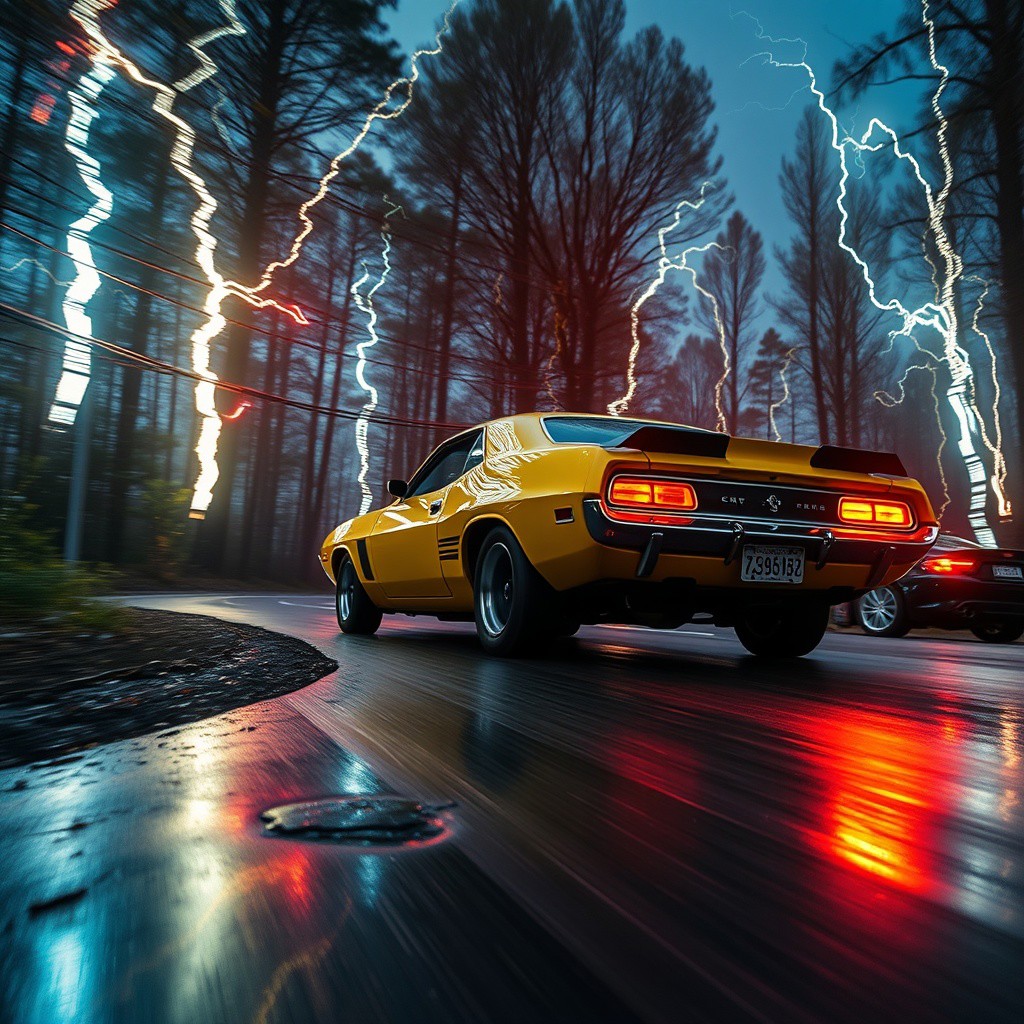 A cinematic close view shot of the one oldschool muscle car speeding down a forest road at night, reflecting the bright, rare colorful lights from surrounding electrical supernatural anomalies, with rain-slicked damaged and curvy roads creating a mirror effect of the car’s sleek yelow body. The night in the background enhances the vibe of this intense country drive scene. Only one car.