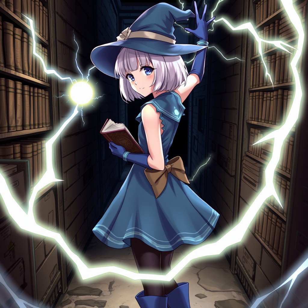 1 girl, solo, p3elizabeth, short hair, bob cut, white hair, blunt bangs, p3elizabeth-dress, hat, sleeveless dress, blue dress, bare shoulders, gloves, blue gloves, pantyhose, black pantyhose, boots, blue footwear library, holding book, book, grimoire, looking at viewer, faint smile, official art, electricity, magic, lightning, glowing,,dynamic pose, energy ball ,fighting stance, from side, cinematic angle, looking back, archaic smile, narrow dirty alleyway, closed mouth,Raise one arm, black hole