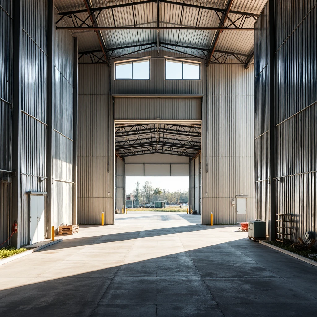 "A large industrial warehouse viewed from the outside, with metal walls and large access doors. The building has tall windows that allow natural light to enter. The surrounding area is spacious and may include elements such as parking lots, vegetation, or access roads."