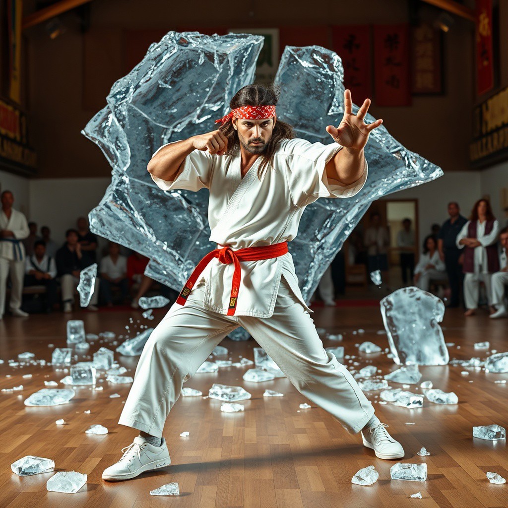 A karate man performing a karate pose, Destroyed ice block background, in a dojo setting, ((Sean Connery)) , Bandana, long hair, jersey, white sneakers, muscular, 2 meters tall,Ice pieces are scattered on the floor. he has a determined expression, wearing a traditional white karate gi with a colored belt. and spectators are watching in awe in the background. The dojo features wooden flooring and colorful banners on the walls, with bright lighting highlighting the action and the scattering ice shards. masterpiece,