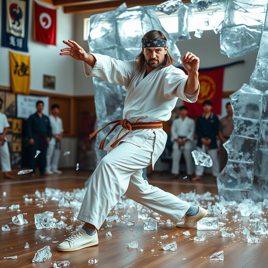 A karate man performing a karate pose, Destroyed ice block background, in a dojo setting, ((Sean Connery)) , Bandana, long hair, jersey, white sneakers, muscular, 2 meters tall,Ice pieces are scattered on the floor. he has a determined expression, wearing a traditional white karate gi with a colored belt. and spectators are watching in awe in the background. The dojo features wooden flooring and colorful banners on the walls, with bright lighting highlighting the action and the scattering ice shards. masterpiece,
