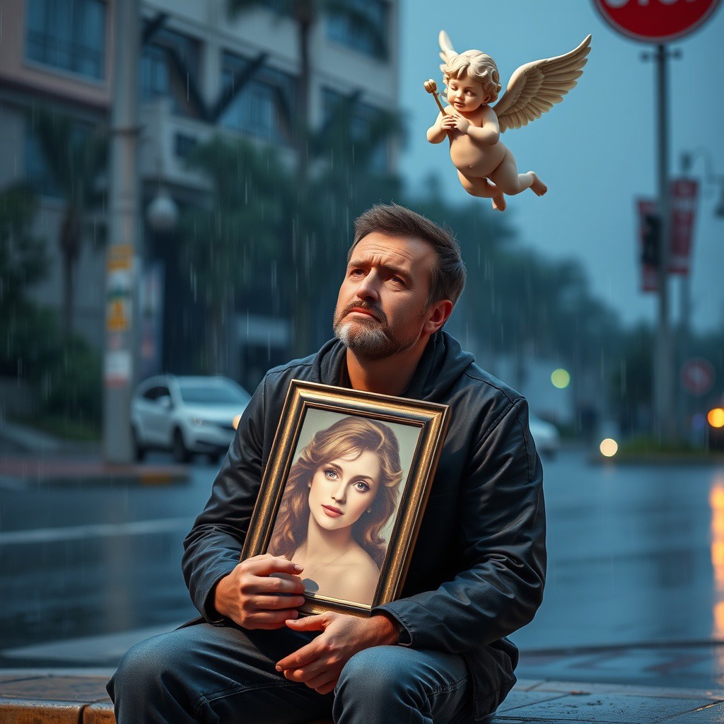 A man sad while it is raining holding a picture of a woman while a sad cupid Flys away above the man is sitting on the street corner outside