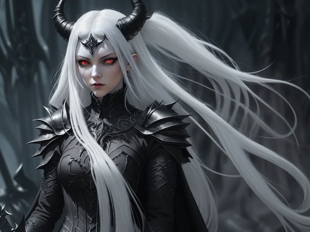 A dark fantasy digital illustration or concept art of a powerful female demon character. She has pale, ethereal skin, long flowing silver hair, and piercing red eyes that radiate intensity. Her head is adorned with sharp, curved black horns, and she is dressed in intricate black armor with gothic patterns that exude strength and elegance. The character wields a sleek black sword, held firmly in front of her. Behind her, a pair of massive, bat-like wings spread wide, featuring detailed textures and a dark, menacing aura. The background is engulfed in fiery shades of red and orange, with embers and shards of black debris floating around, adding to the chaotic and hellish atmosphere. Her expression is fierce and commanding, embodying both beauty and terror. The overall artwork has a highly detailed and dynamic composition, with bold contrasts and vivid colors that emphasize the mystical, dark, and powerful essence of this demon warrior. cyberpunk