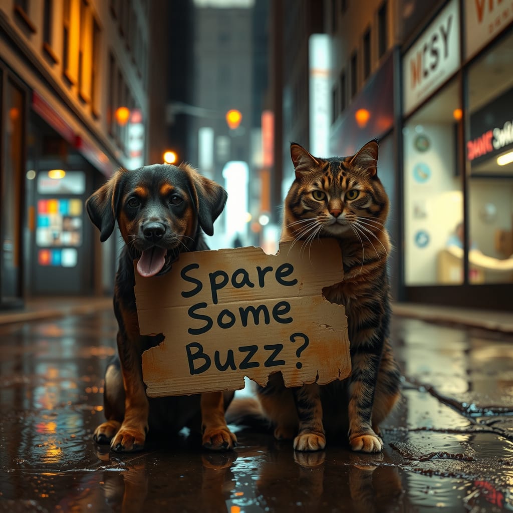 A dejected dog with ears weighed down by the rain and a bedraggled cat with matted whiskers stand united, paws side by side, clutching a sodden cardboard sign that reads "Spare Some Buzz?" in crude, water-bleached letters. The alleyway, a kaleidoscope of reflected city lights, glistens with rain-soaked puddles that mirror the neon glow of towering skyscrapers. Inspired by the gritty urban landscapes of Andreas Gursky, the moody lighting of Gregory Crewdson, and the cinematic grandeur of Roger Deakins, this cinematic film still is rendered in warm, muted tones, with a subtle film grain and vignette, evoking the nostalgia of 35mm film. The atmosphere is thick with tension, the air heavy with the promise of a stormy night, as the unlikely duo waits in hope of a sympathetic stranger.