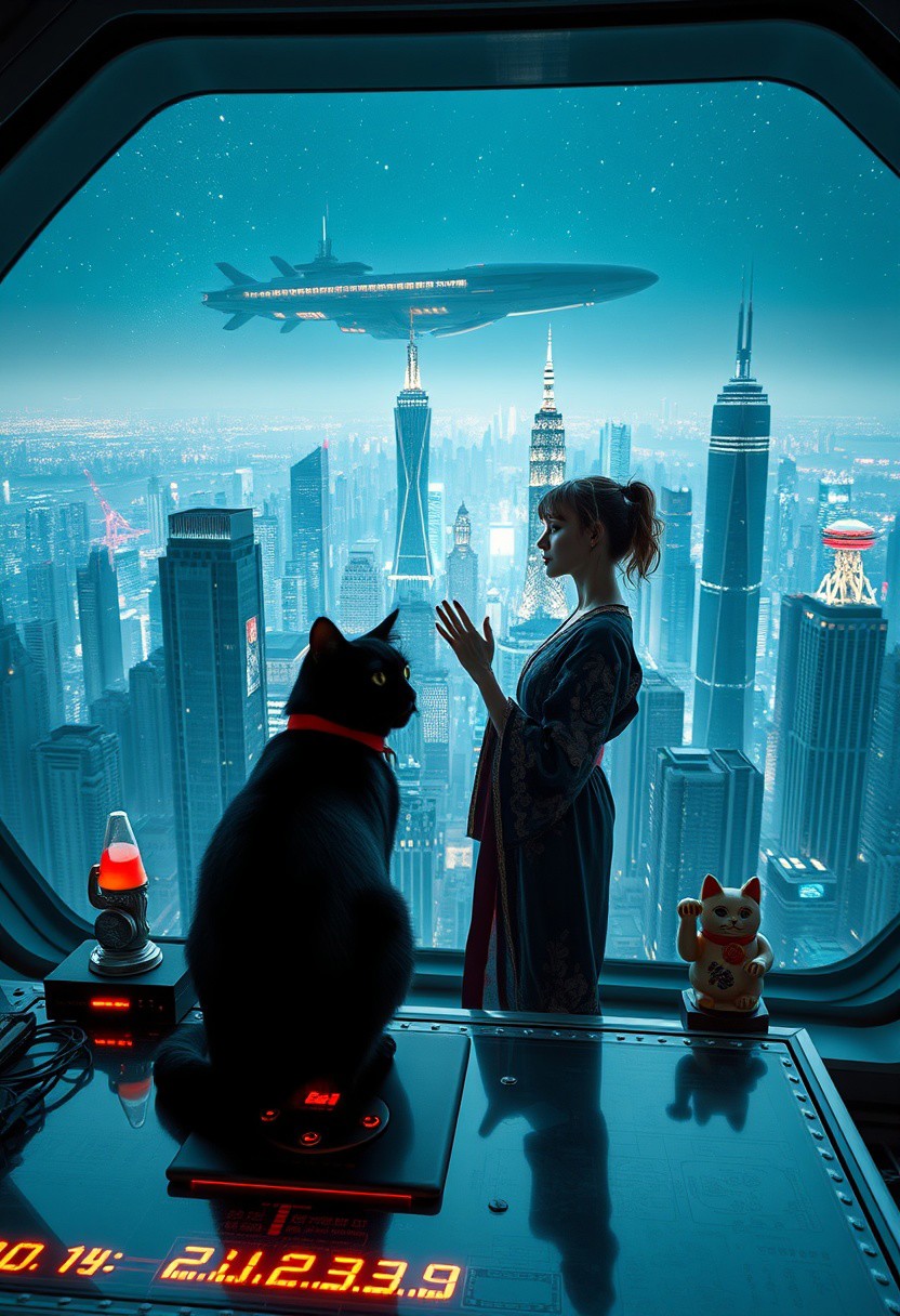 A sleek black cat with red collar sits on a cluttered metal riveted desk with transparent top and rgb led computer components visible inside, On the desk are a maneki neko statue and a lava lamp, the Black Cat is looking out of a seamless and futuristic floor to ceiling window that looks out at thousands of enormous wide and tall futuristic skyscrapers from a large window in a descending spaceship, a beautiful woman, 24 years old, is standing next to the cat looking at the viewer holding out her hand in a welcoming gesture, out the window is the enormous city at night, filled with buildings of many shapes and sizes, some over a mile tall))), the woman is dressed in an ornate Japanese style bath robe. An enormous deco starship with futuristic lighting and design is visible high above the city, and a space station is visible in the background among the stars, The woman's hair is messy from just waking up and tied up with a ribbon. Artistic cyberpunk, dynamic perspective, (((overall architectural aesthetic is Art Deco Cyberpunk))). (((A large futuristic building shaped like a torii gate stands among the enormous tokyo structures,)))