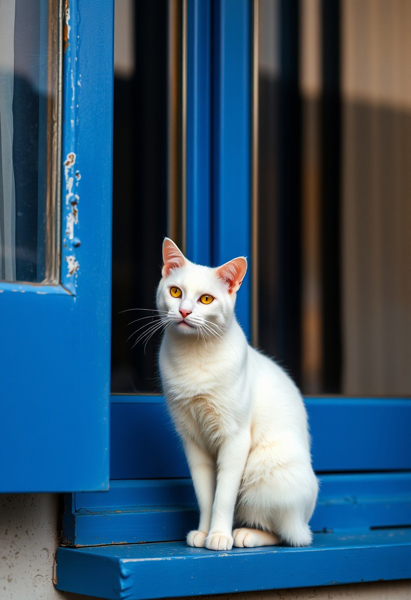 (Soft Lighting Photography by Mimoza Veliu and Mario Giacomelli:1.2), NSFW, a cat sitting besides the window, The window frame painted in a matching blue with subtle metallic highlights, adds depth and balance to the composition. The overall aesthetic is simple yet impactful, emphasizing the contrast between the vivid blue and the clean, soft white of the cat, creating a visually captivating and serene atmosphere, a minimalistic and striking scene.