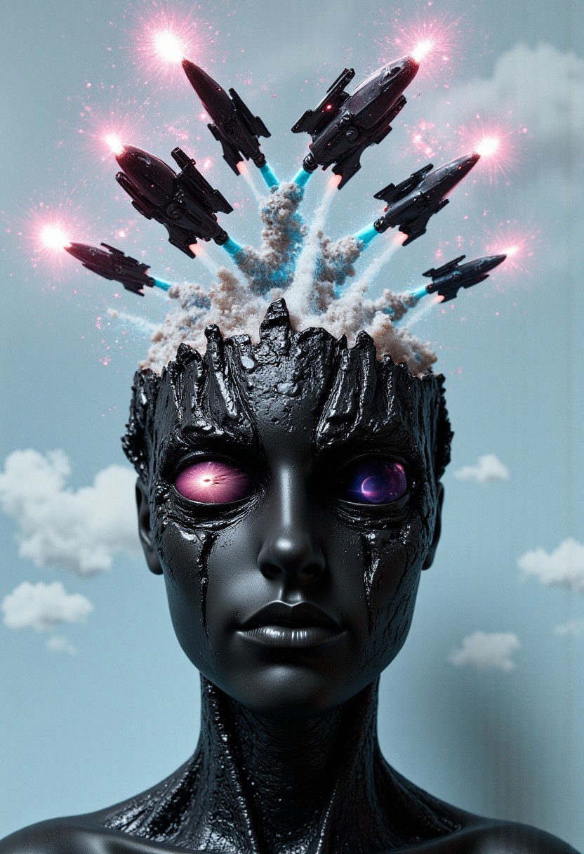 A hyper-realistic photo of starships launching out from the inside of an open head, the face is matte black and smooth with a galaxy in its eye sockets, the body has craters on it, there's depth to the scene so that you can see stars and planets outside the half-closed eyes, the sky behind them looks like water, and the whole background is cloudy grey/white. The figure stands against a light blue wall, close-up of one side of their hair, pink starbursts grow around their neck, creating a surreal atmosphere.