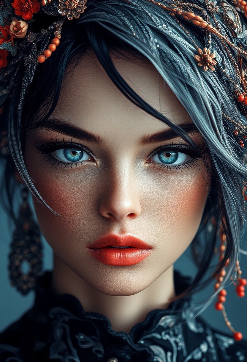 Midjourney_Whisper, A hyper-realistic portrait of a stunning supermodel, featuring a beautifully detailed face with captivating eyes and a serene expression, The image showcases her natural beauty, focusing on her flawless skin and delicate features, The composition blends modern and traditional elements with a neo mode, avant-garde style, characterized by elegant lines, vibrant colors, and exquisite details, Her hair is styled in an intricate and unique fashion, adding to her ethereal and timeless aura, The lighting enhances her features, creating a soft interplay of light and shadow, while the high-resolution quality captures every detail with photorealistic clarity