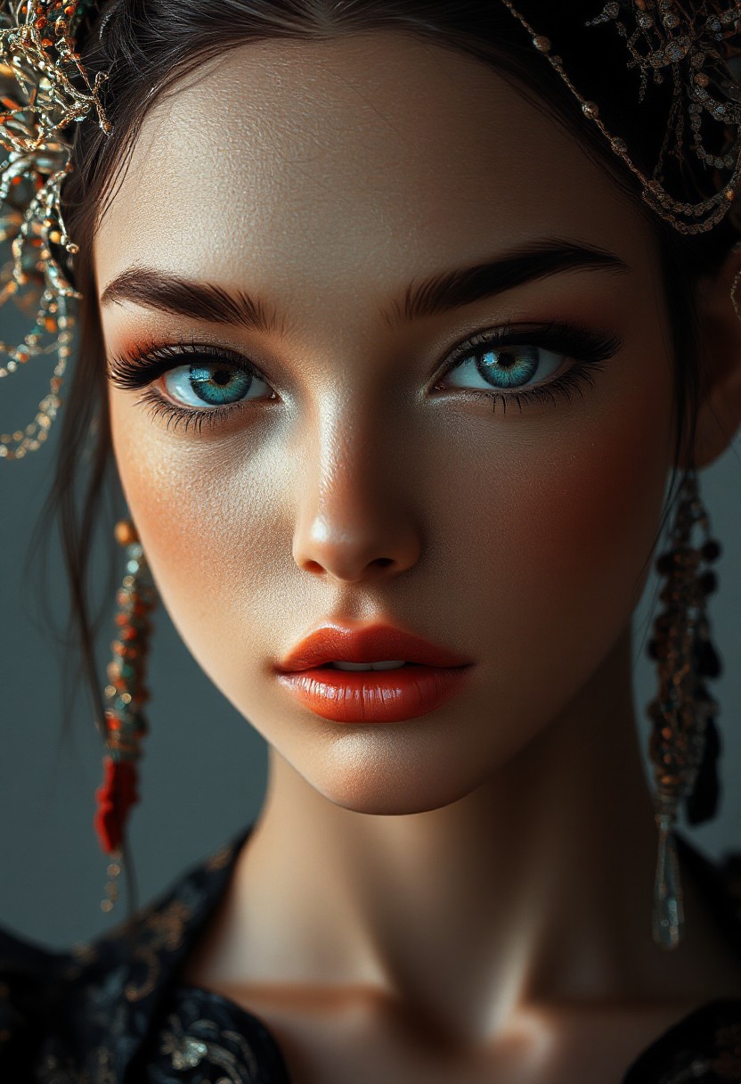 Midjourney_Whisper, A hyper-realistic portrait of a stunning supermodel, featuring a beautifully detailed face with captivating eyes and a serene expression, The image showcases her natural beauty, focusing on her flawless skin and delicate features, The composition blends modern and traditional elements with a neo mode, avant-garde style, characterized by elegant lines, vibrant colors, and exquisite details, Her hair is styled in an intricate and unique fashion, adding to her ethereal and timeless aura, The lighting enhances her features, creating a soft interplay of light and shadow, while the high-resolution quality captures every detail with photorealistic clarity