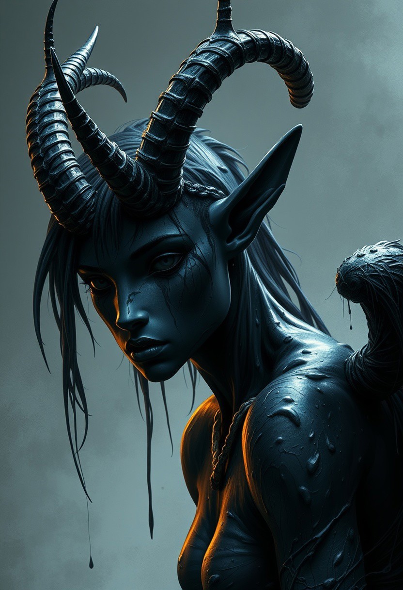 Fantasy. Black centaur girl with straight sharp horns, no eyes. Skin covered with black slime, similar to latex.