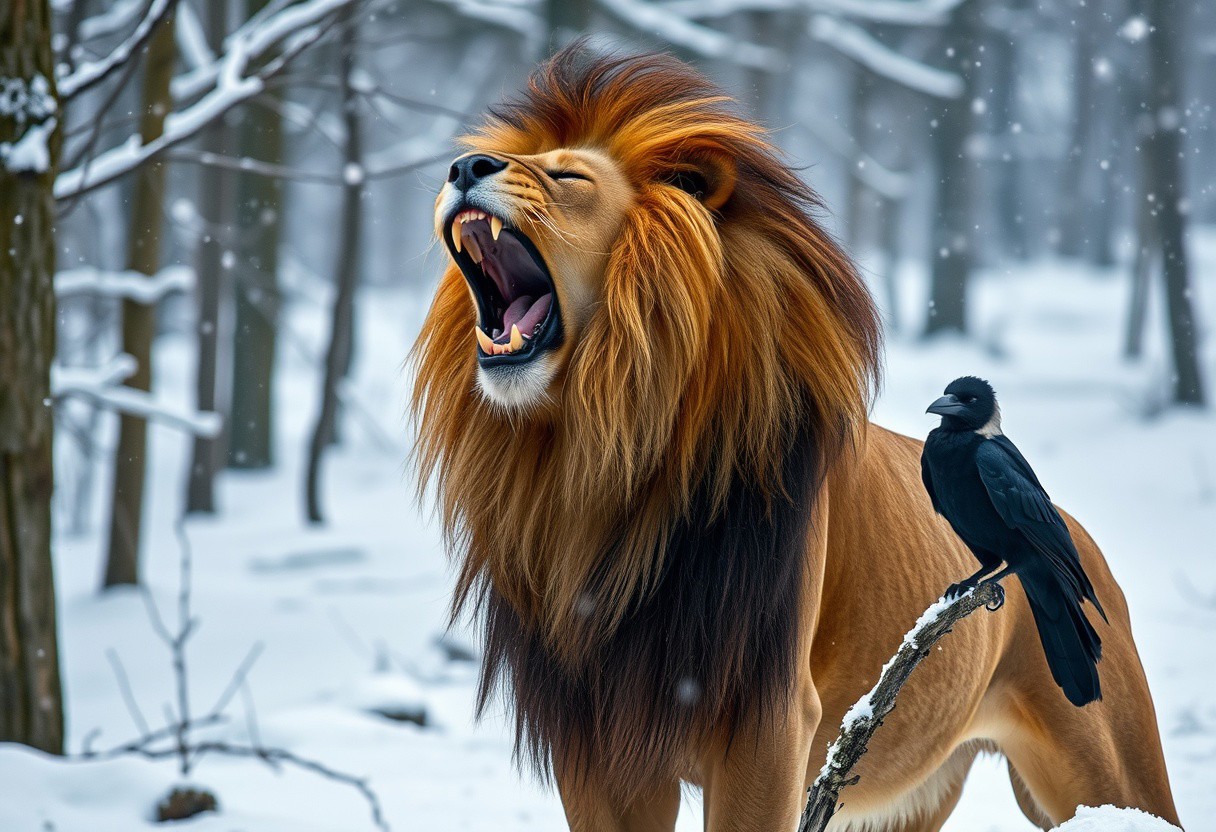 A picture of a lion with long manes standing and roaring in a snowy winter forest. It is a snowy day and snow is falling, and a beautiful black and white crow is perched on a tree.