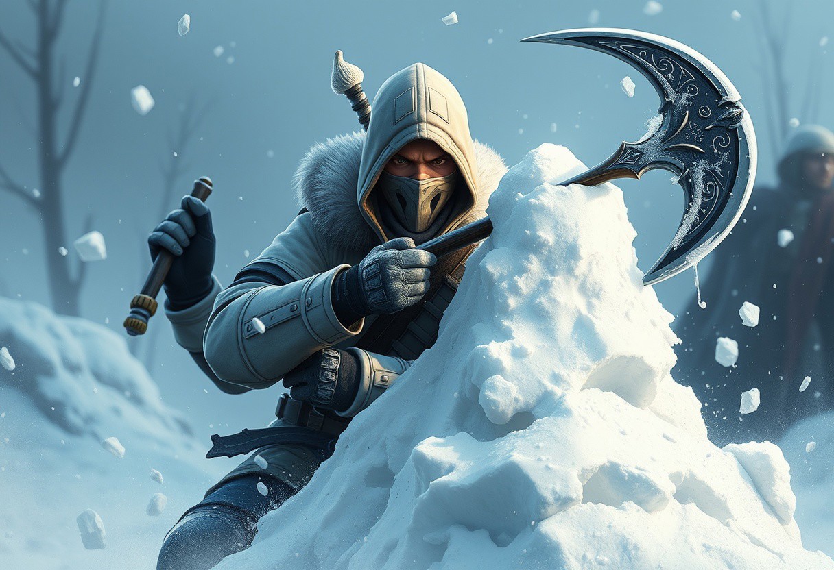 Create a highly detailed, dynamic concept art piece featuring a white American soldier from Mortal Kombat 11, wielding a sickle and taking cover behind a pile of snow. The character should be in an action pose, with a sharp focus on their facial expression and attire. The background should be a cold, snowy environment, with elements inspired by the fantasy world of Genshin Impact. The art style should be reminiscent of Dungeons and Dragons illustrations, with a matte finish and trending aesthetics found on Artstation. The image should be suitable for featuring on Unsplash.