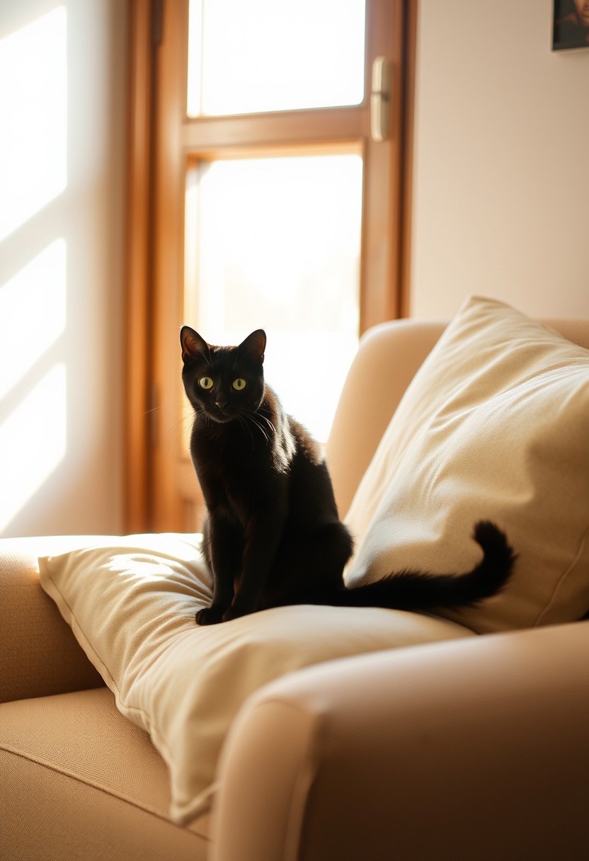 (Soft Lighting Photography by Mimoza Veliu and Mario Giacomelli:1.2), NSFW, one black cat, sitting on an arm chair soft, pillows on the chair, looking at viewer, the sun coming from the window.