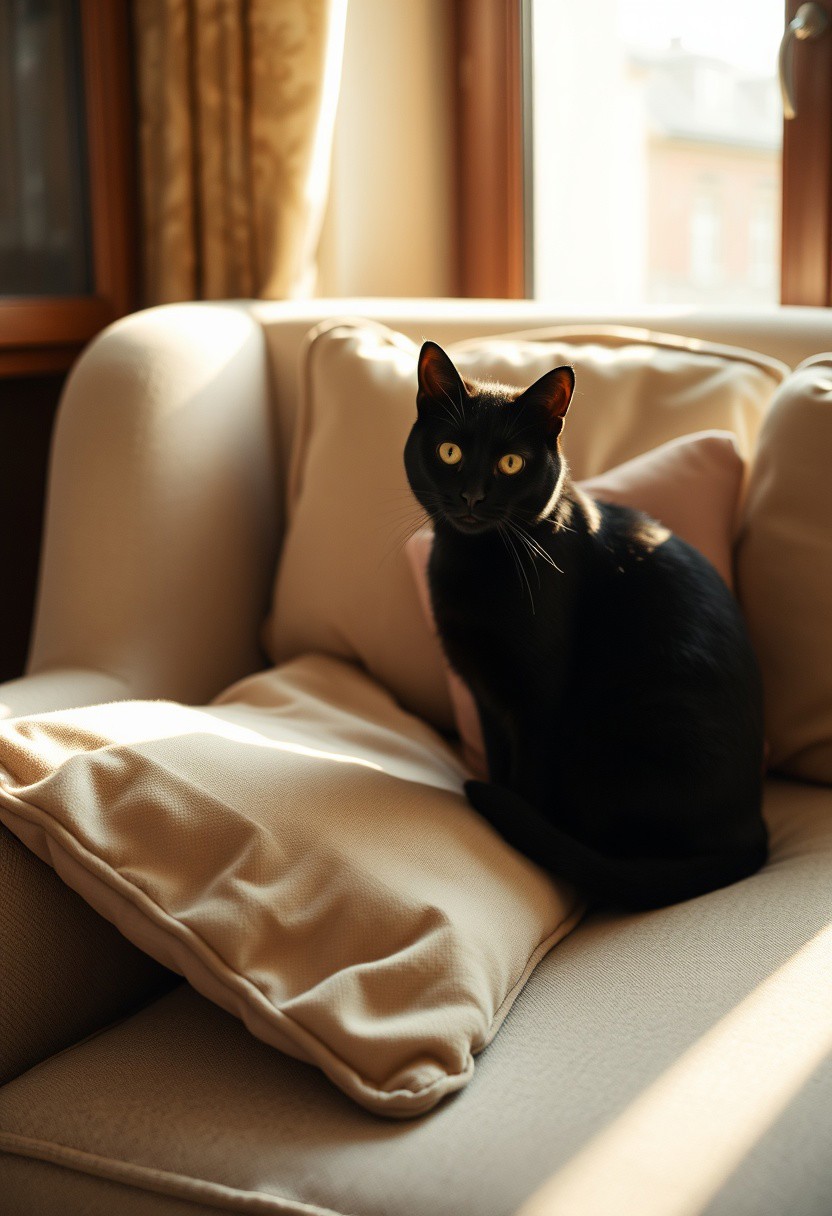 (Soft Lighting Photography by Mimoza Veliu and Mario Giacomelli:1.2), NSFW, one black cat, sitting on an arm chair soft, pillows on the chair, looking at viewer, the sun coming from the window.