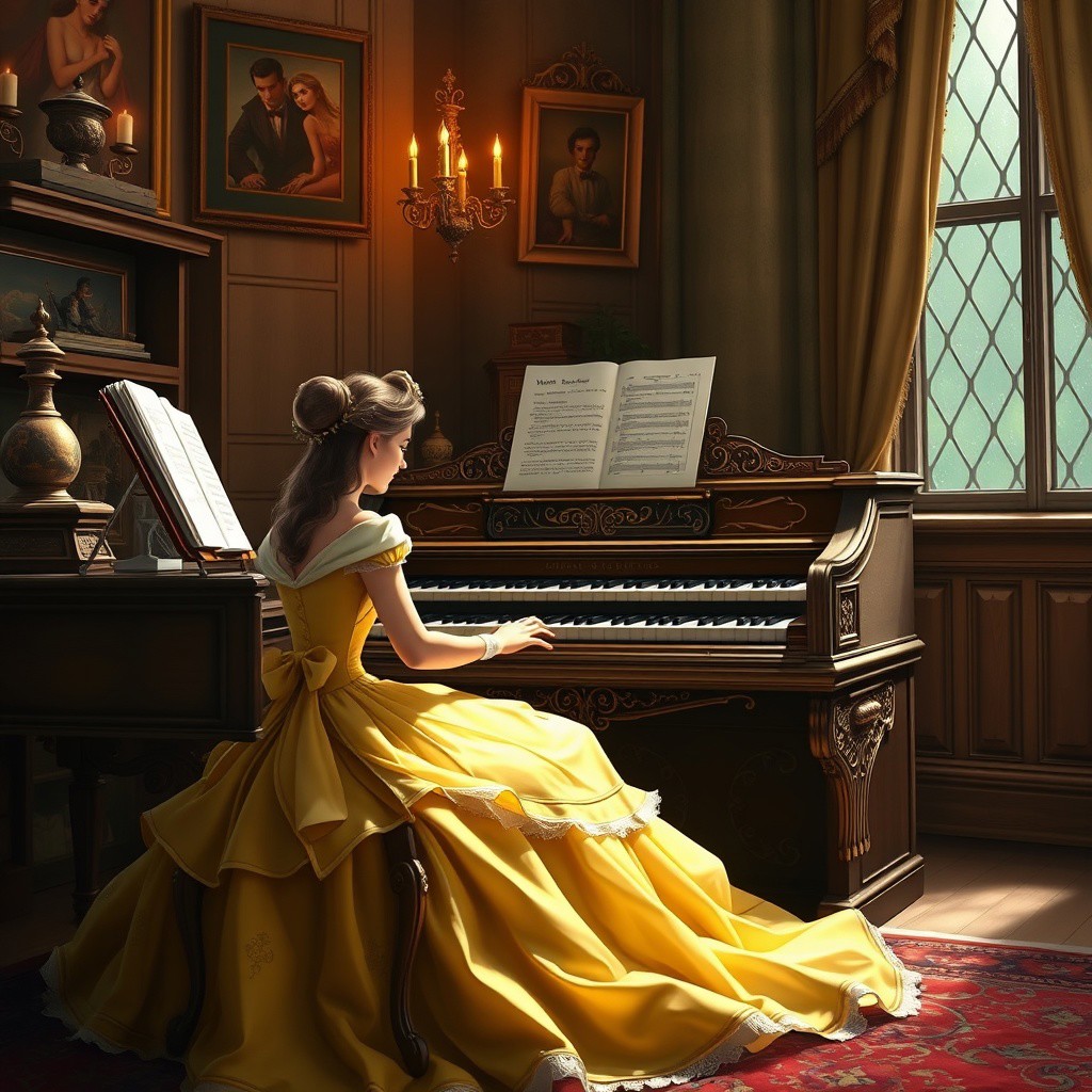 Princess Belle seated at the organ playing organ at home, masterpiece, best quality, digital painting, HDR, Pixar style Painting, extremely detailed 8K, high resolution, ultra quality,