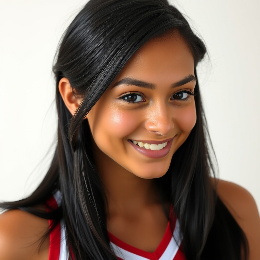 Beautiful high school cheerleader with a lovely smile. Raven black hair, shoulder length, swept behind the ear. Tanned skin. Brown eyes. SMiling