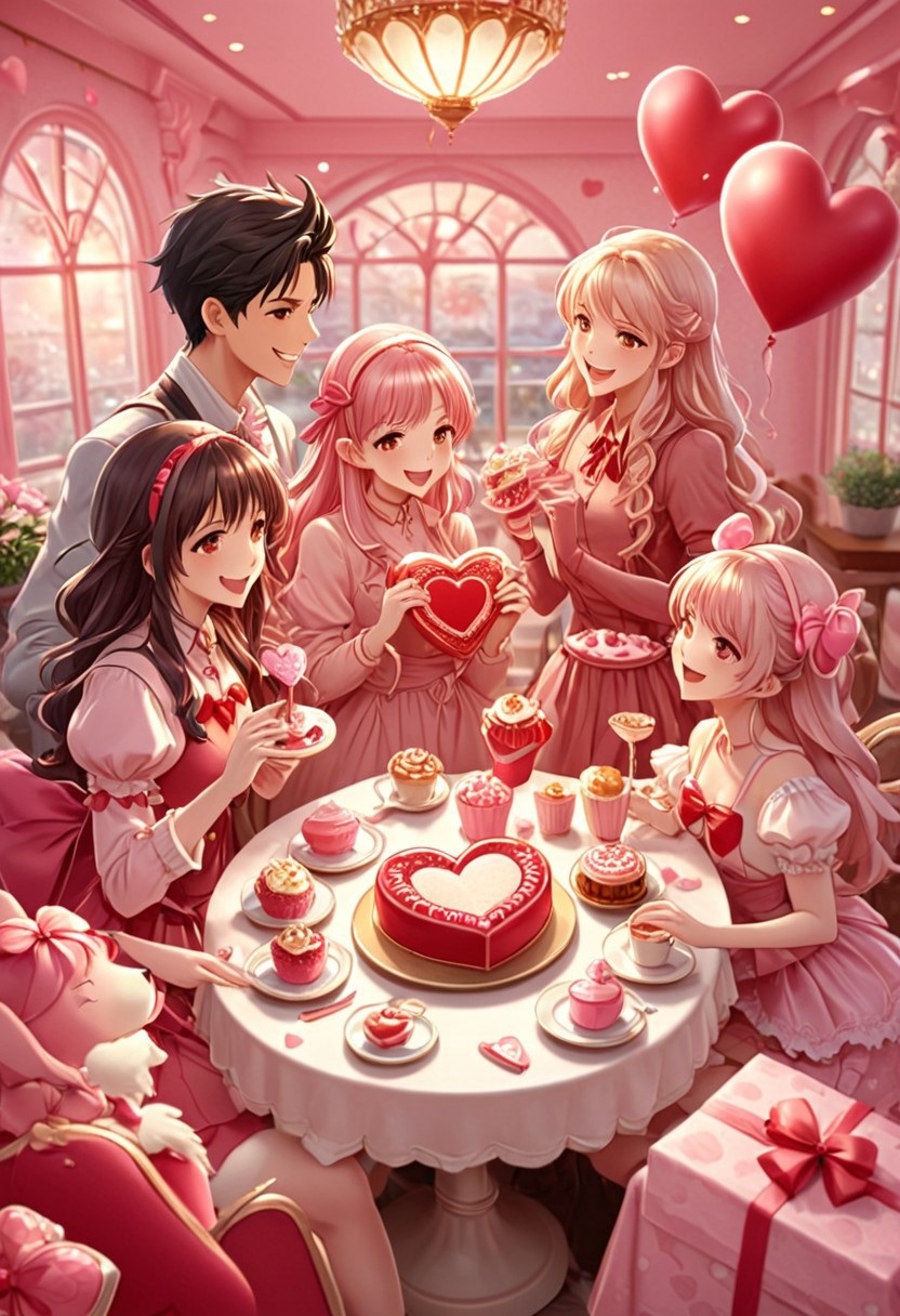 Valentine, A lively group of anime waifus gathers in a pastel-lit café, exchanging heart-shaped gifts and laughing over decadent desserts. The air sparkles with soft pink and gold hues, capturing the warmth of Galentine’s Day.