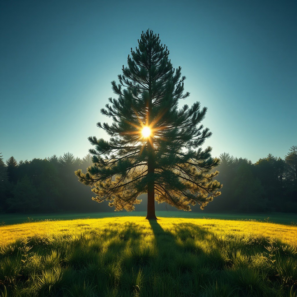 A full size shot of a verdant hyper-realistic landscape. A huge pine tree in the middle of the frame, back lit, dynamically, by the dawning sun behind it. Enhanced clarity, perfect detail, 4k UHD, brilliant highlights