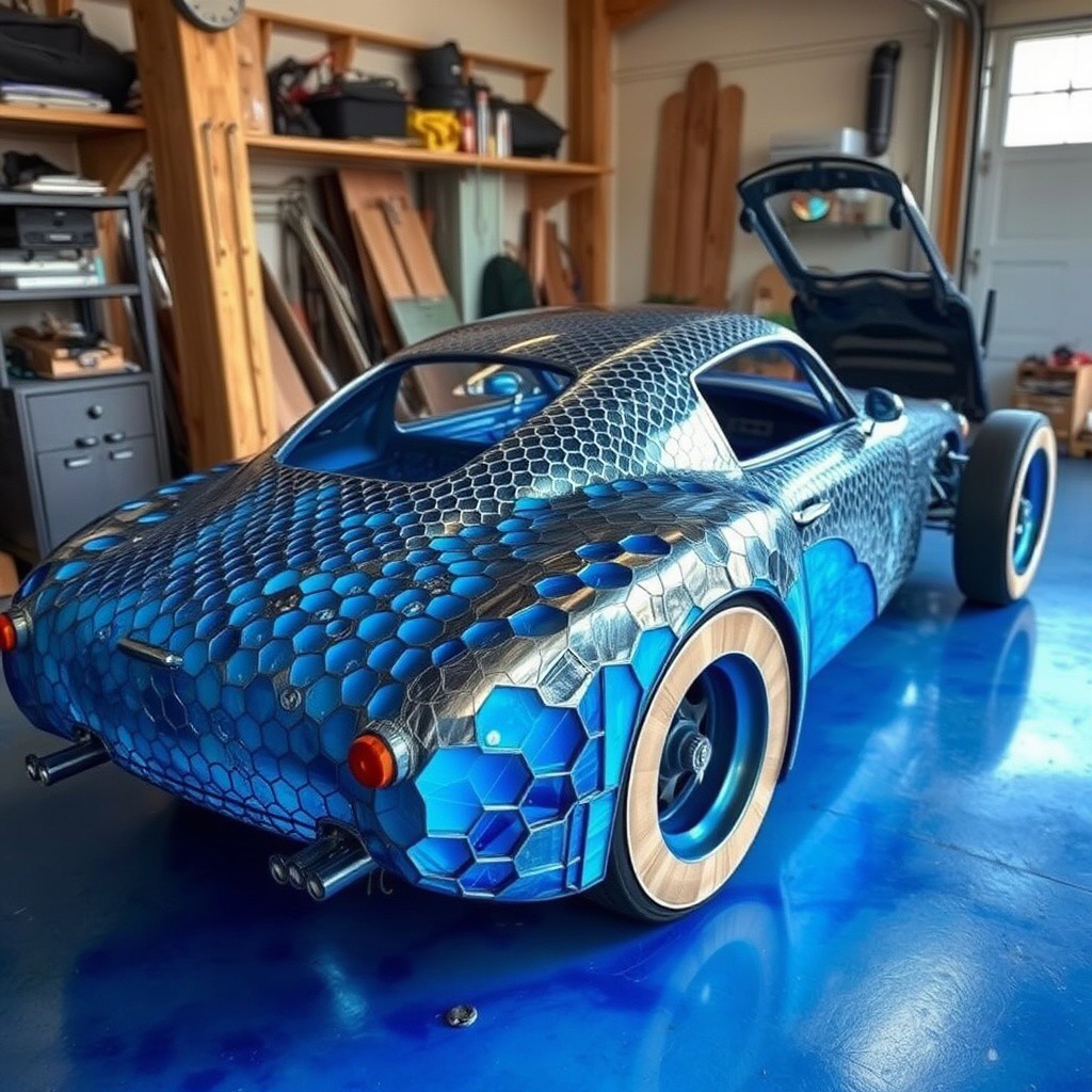 car made of titanium honeycomb filled with blue epoxy resin, view 3/4, car in garage, wheels made of reclaimed wood
