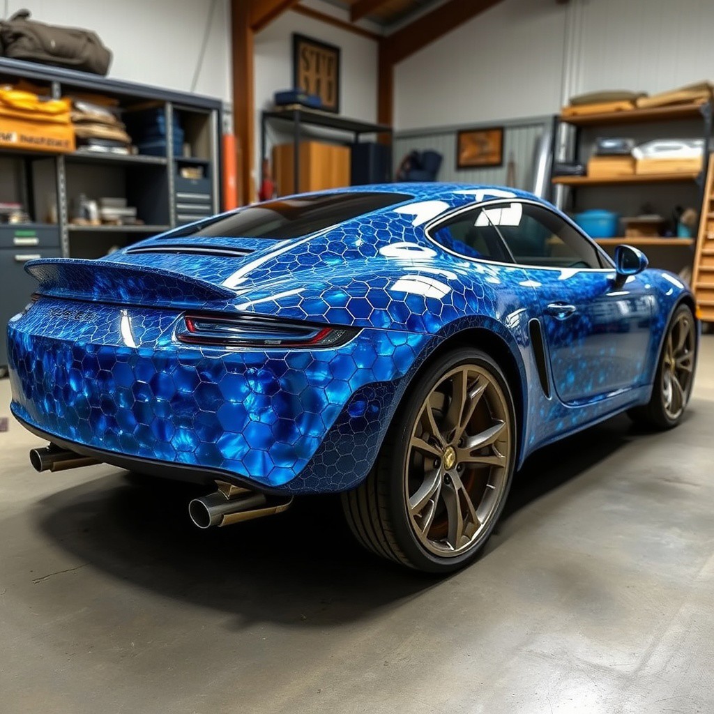 car made of titanium honeycomb filled with blue epoxy resin, view 3/4, car in garage, wheels made of reclaimed wood