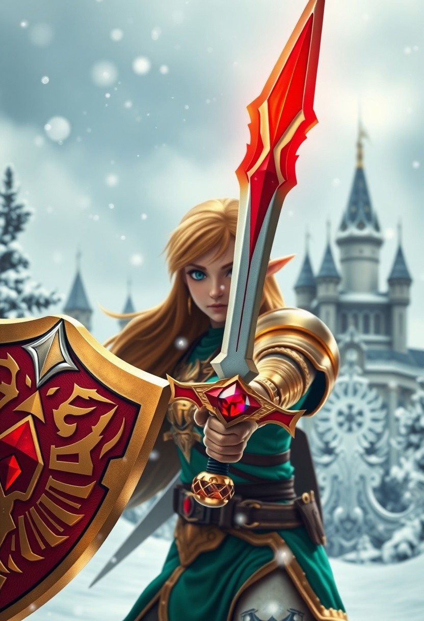 Princess Zelda prepares for an imminent attack, her hand firmly clutching a shield embellished with vibrant shades of gold and deep red. In her other hand, she brandishes a radiant longsword, distinguished by its pommel crafted from ruby and a blade featuring fierce, serrated edges accented with crimson highlights. Clad in robust armor of gold and ruby, along with a matching helmet, she embodies the spirit of Valentine's Day. The backdrop reveals a stunning winter wonderland, with snowflakes gently falling and a majestic castle rising in the distance.