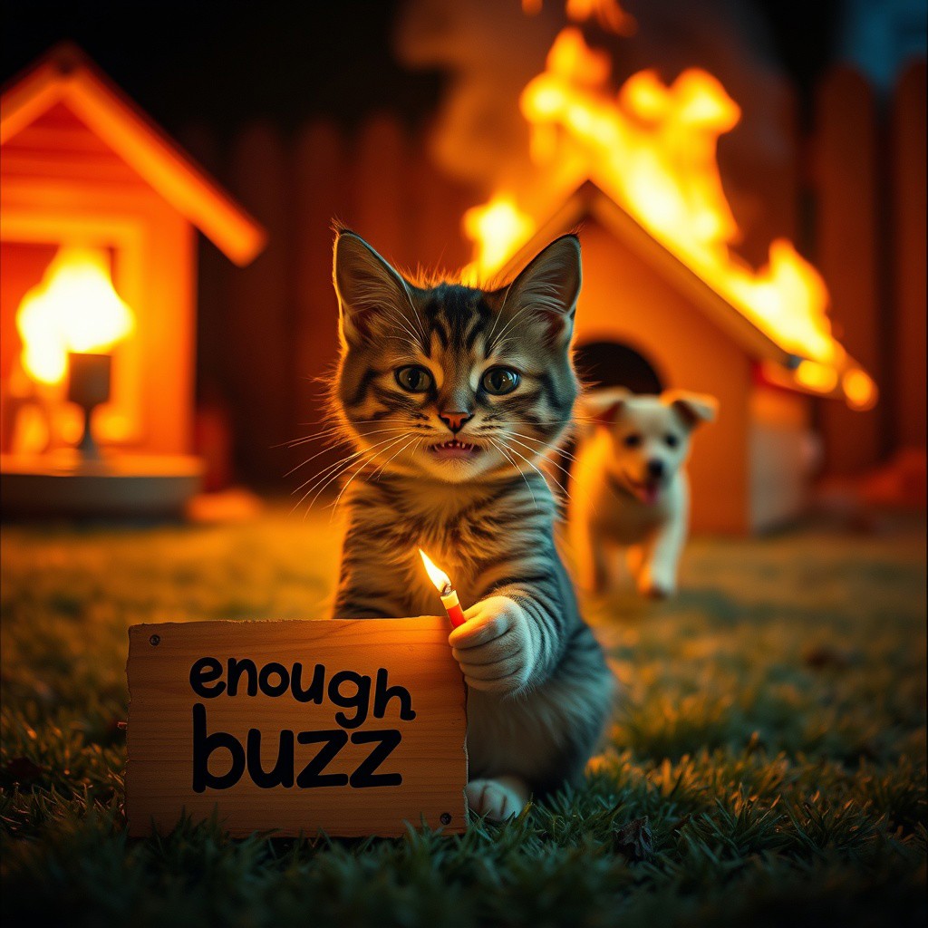 A cute cat is sitting in the foreground, holding a lit match. A sign says "not enough buzz", the sign is in focus. Behind is a doghouse on fire. The cat has an evil grin on his face. A cute yellow dog is on fire, running around the backyard in panic. The scene is framed with a soft, nostalgic film grain, color-graded to enhance the warm, amber hues of the firelight, creating a charming yet eerie atmosphere. Directed in the style of Tim Burton, the lighting setup includes a warm, orange-hued key light from the fire, casting soft, diffused shadows, and a cool, blue rim light from the back to add depth and contrast. The composition uses the rule of thirds.