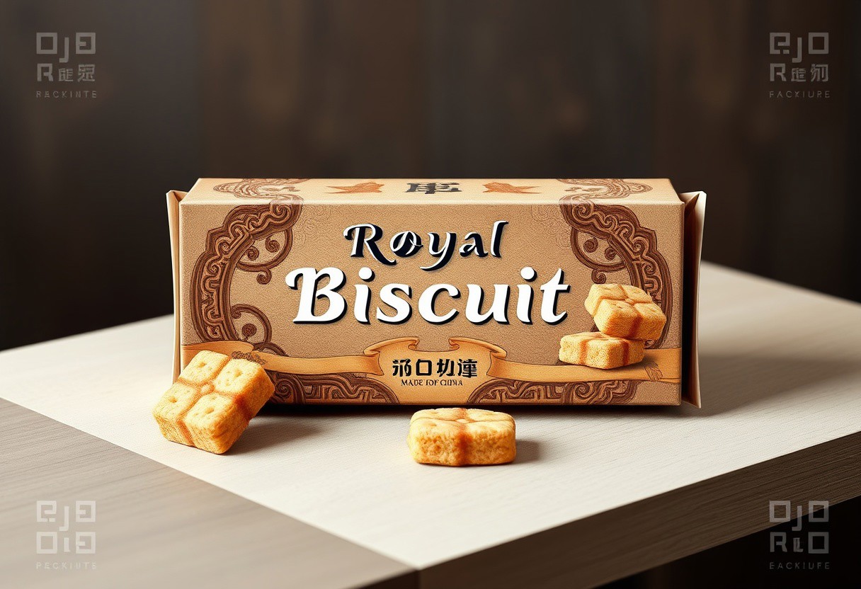 A hyper-detailed illustrator product cover design, eye-catching, elegant, Biscuits Box set, Text:"Royal Biscuit", "Made in China", 300 years old". . Apply 60-30-10 rule: 60% primary color: Earth Tones, Light Wood 30% secondary color: Dark Wood 10% accent color: Soft Green, Light Grey, Beige.