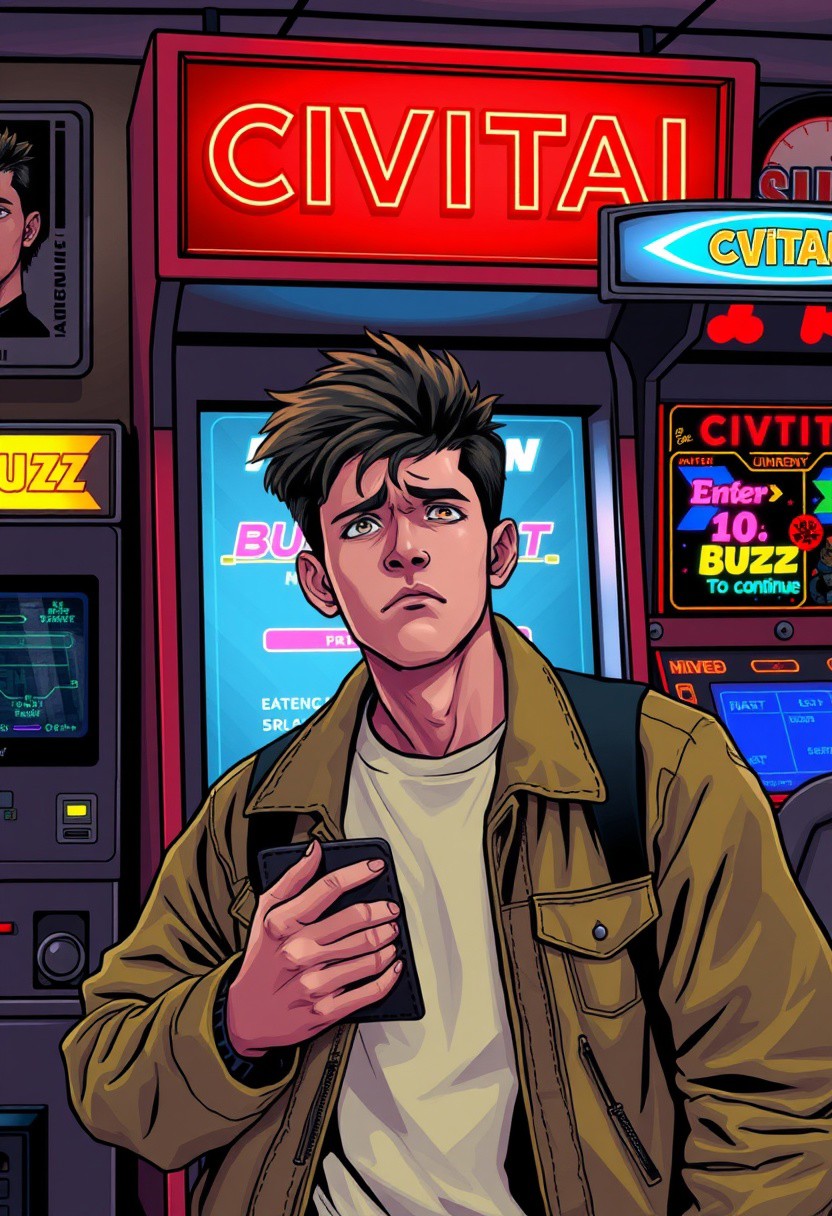 an 18 year old man in the 90s wearing 90s clothes desperate with a worried face looking for money in his empty wallet looking at an arcade with the name "CIVITAI" where the screen says "enter 10 BUZZ to continue"