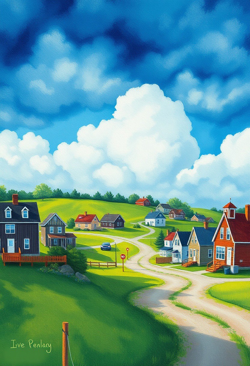 a simple uncluttered stylish cozy small-town village. It should be scenic and picturesque. Include elements such as a quaint little village, green farmland, deep blue cloudy sky, vibrant, cute, stormy, surreal, flat, acrylic, concept art, oil painting, watercolor
