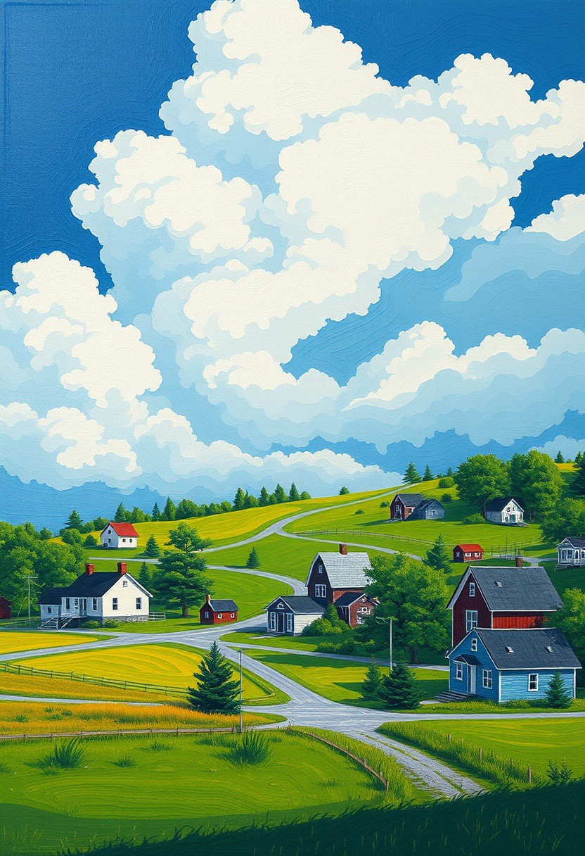 a simple uncluttered stylish cozy small-town village. It should be scenic and picturesque. Include elements such as a quaint little village, green farmland, deep blue cloudy sky, vibrant, cute, stormy, surreal, flat, acrylic, concept art, oil painting, watercolor