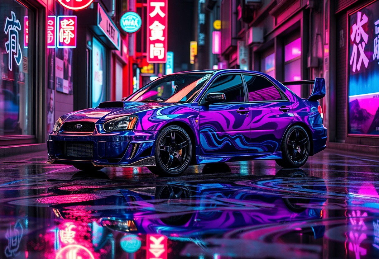 A 2006 subaru wrx sti sedan, coated in a Liquid Marble blend of deep indigo, ultraviolet purple, and electric cyan, parked in a narrow Tokyo alleyway glowing with vibrant neon lights. The wet pavement has transformed into a glossy Liquid Marble surface, swirling with reflections of neon pinks and blues, shifting like an otherworldly mirror. Neon kanji signs flicker on the walls, their distorted reflections stretching across the fluid-like ground. The chrome bumpers and round side mirrors shimmer, absorbing the ambient glow, while the black alloy wheels with polished lips contrast against the flowing, futuristic scene.
