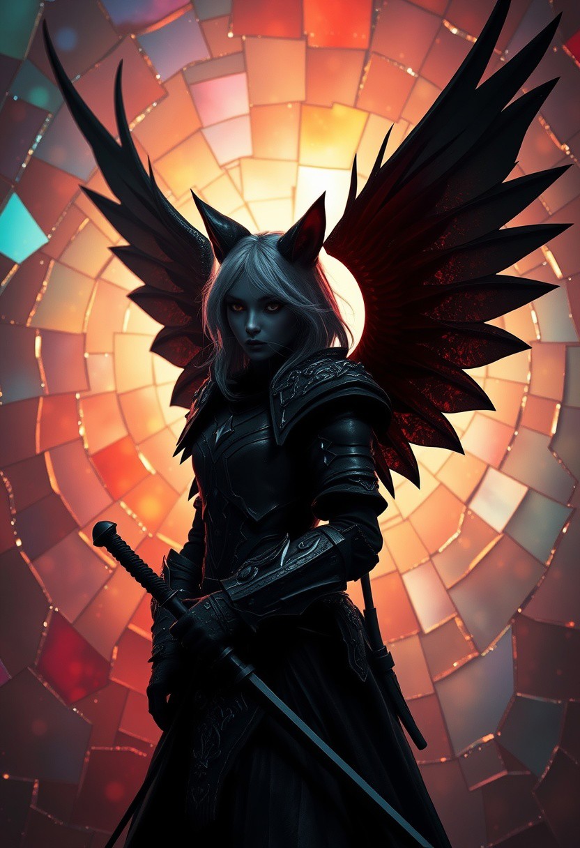 The focus is on a female cat silver haired demon hunter whose armor is partially fractured and shattered like it was glass. The backdrop is composed of different colors transitioning from warm reds and yellows near the center to calming blues and greens toward the periphery. The backdrop is centered behind the subject. The colors are separated by metallic fractures, creating a glowing mosaic effect. The colors of the backdrop are most intense near the center. The backdrop is partially shattered like glass. The subject itself is a stark and gloomy silhouette, contrasting beautifully against the vibrant, light-filled fragments surrounding it. The hunter has majestic feathered wings, but they are not the focus. Emphasis is placed on the hunter and the backdrop. The hunter is armed and about to fight.