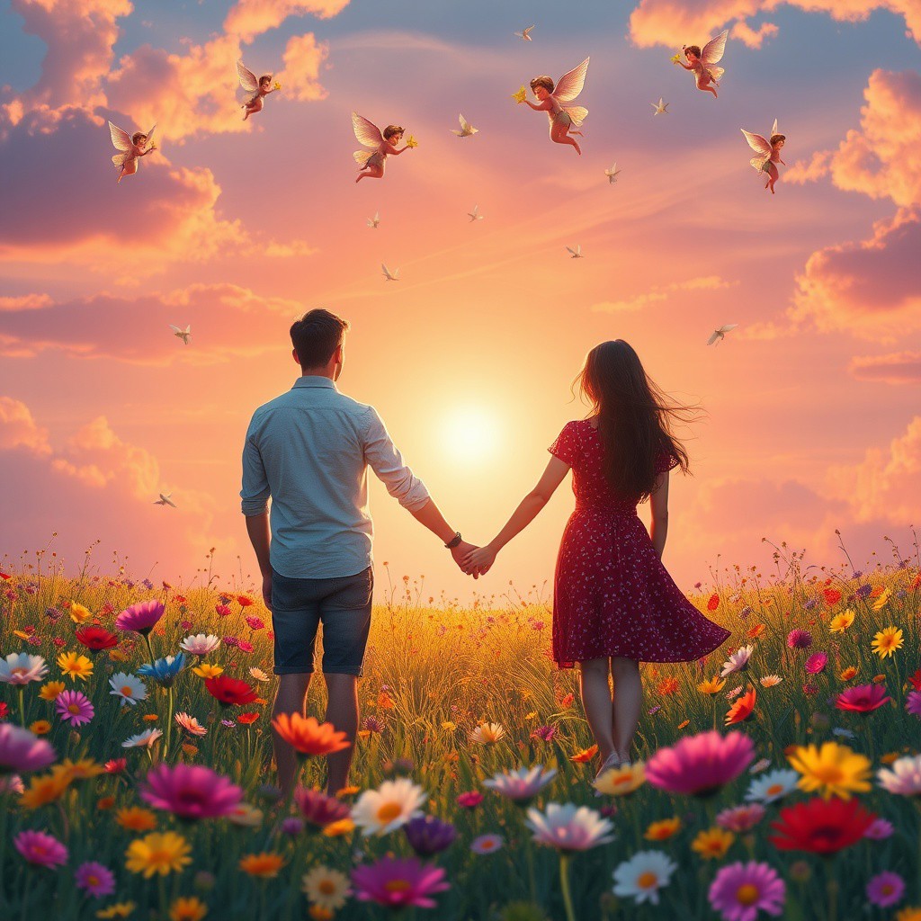 a couple holding hands facing the sunset in a meadow of colorful flowers and cupids and fairies are flying around above them