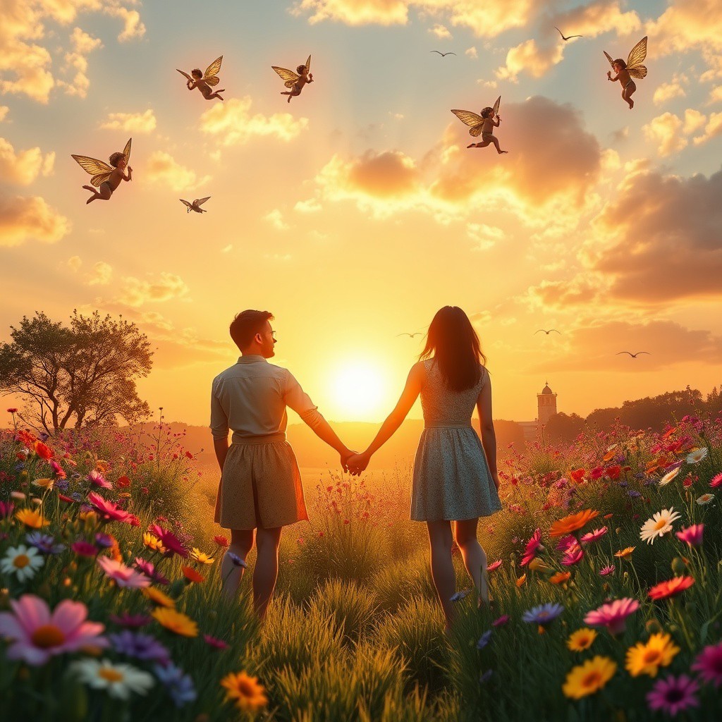 a couple holding hands facing the sunset in a meadow of colorful flowers and cupids and fairies are flying around above them