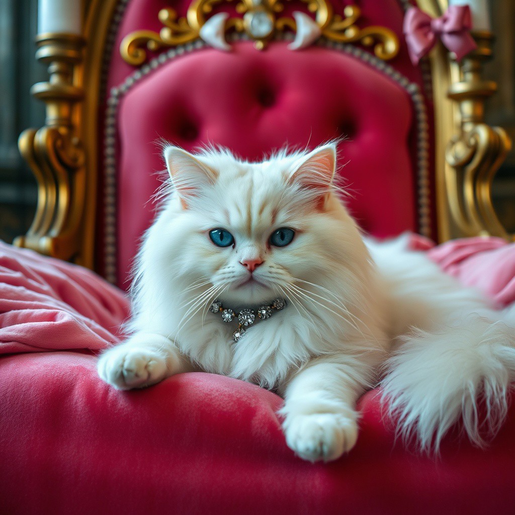 Reigning with serene grace, a magnificent white Persian purebred long-haired cat, adorned with a resplendent diamond collar, exudes royal elegance as it reclines on a plush pink blanket. The creature's luxurious long fur and piercing blue eyes command respect and admiration, embodying the essence of feline nobility amidst the opulent setting suggestive of a throne room fit for pet royals. Velvet, pearls, bows, opulent, lavish