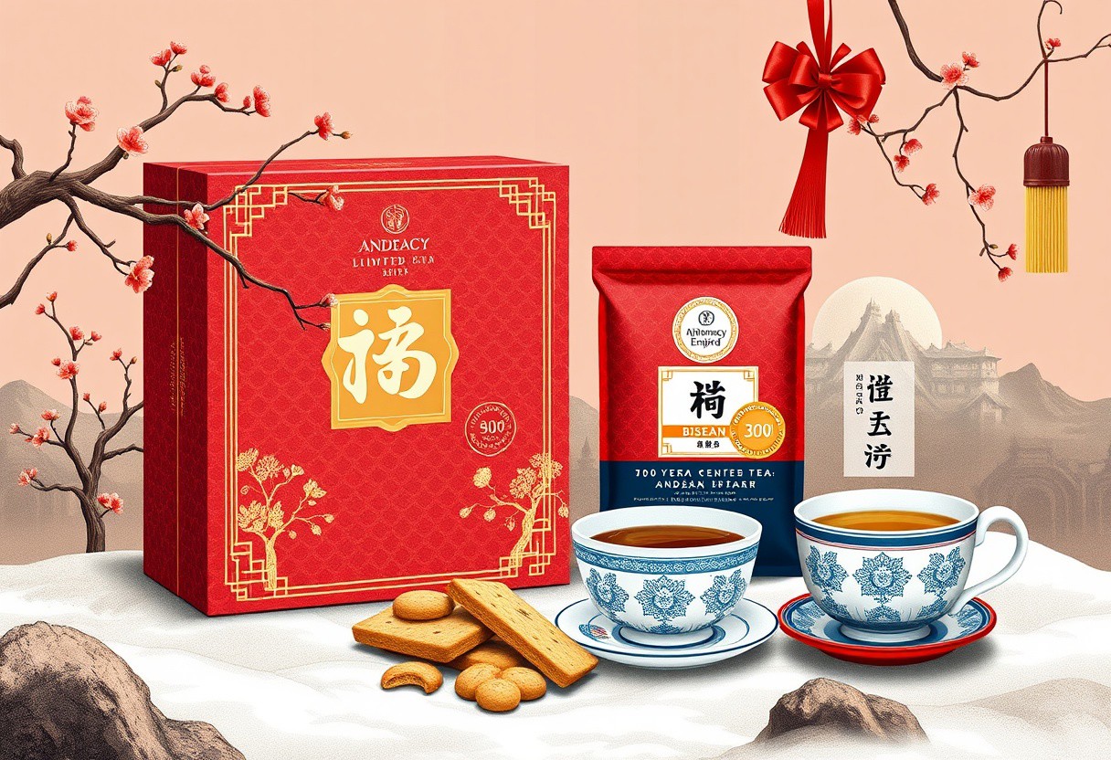 A hyper-detailed illustrator product cover design, eye-catching, elegant New Year giftset, Tea, Biscuits and Tea. Text:"Diplomacy Limited", "Inti Ltd", Brand: "Andean Empire", Slogan: "300 years old". Apply 60-30-10 rule: 60% primary color as brick red, 30% secondary color as light green, 10% decoration coloras mustard yellow and navy blue.