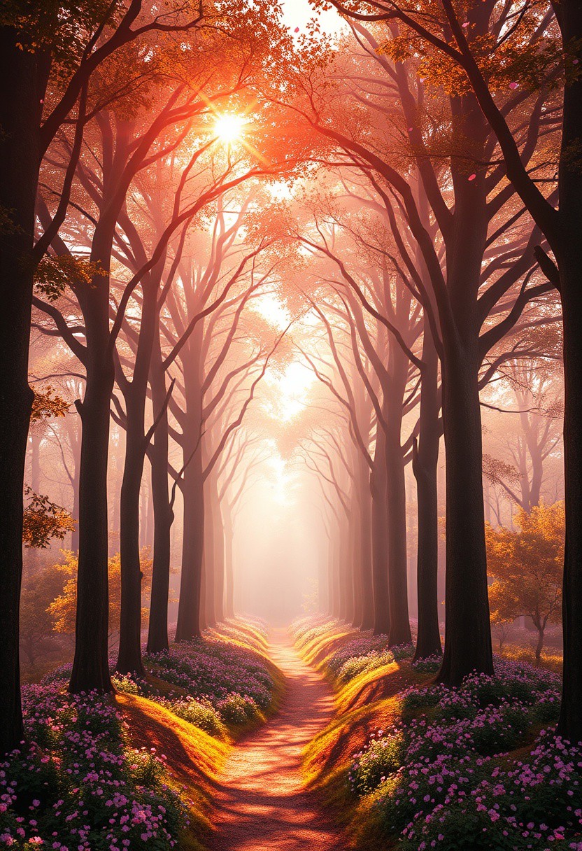 A magical forest filled with tall trees, their lush canopies forming perfect heart shapes. The atmosphere is soft and dreamy, with a warm pink and red glow filtering through the leaves. Delicate petals float in the air, carried by a gentle breeze. The ground is covered in vibrant flowers, and a winding pathway leads deeper into the enchanting forest. The scene is bathed in golden sunlight, creating a romantic, fairytale-like ambiance.