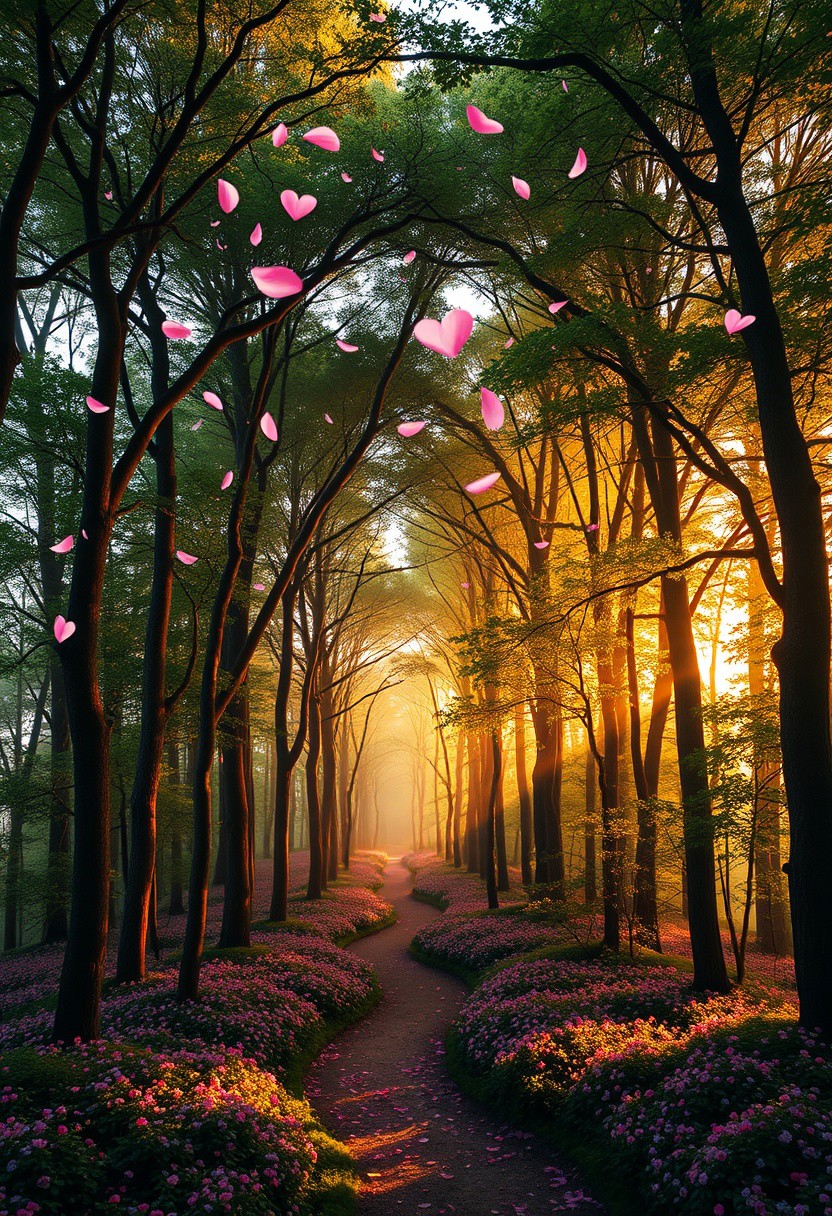 A magical forest filled with tall trees, their lush canopies forming perfect heart shapes. The atmosphere is soft and dreamy, with a warm pink and red glow filtering through the leaves. Delicate petals float in the air, carried by a gentle breeze. The ground is covered in vibrant flowers, and a winding pathway leads deeper into the enchanting forest. The scene is bathed in golden sunlight, creating a romantic, fairytale-like ambiance.