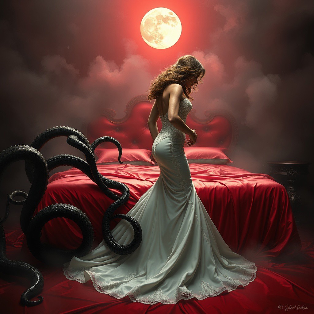 Bride in a sleek, strapless, mermaid-cut wedding gown with delicate lace details and a sweeping train, her hair styled in loose, flowing waves, wearing high heels that glint in the dim light, attempting to struggle free from dark, slithering tentacles that wrap around her waist and arms, pulling her towards a lavish, crimson-hued, wet-look bed with silk sheets and plush pillows, set amidst a thick, eerie fog that swirls around her, illuminated only by the pale glow of a full moon hanging low in the night sky, in the style of H.R. Giger's dark, biomechanical surrealism, combined with the haunting, atmospheric lighting of Zdzisław Beksiński's Gothic paintings, and the intricate, detailed textures of Ash Thorp's dark, futuristic illustrations.