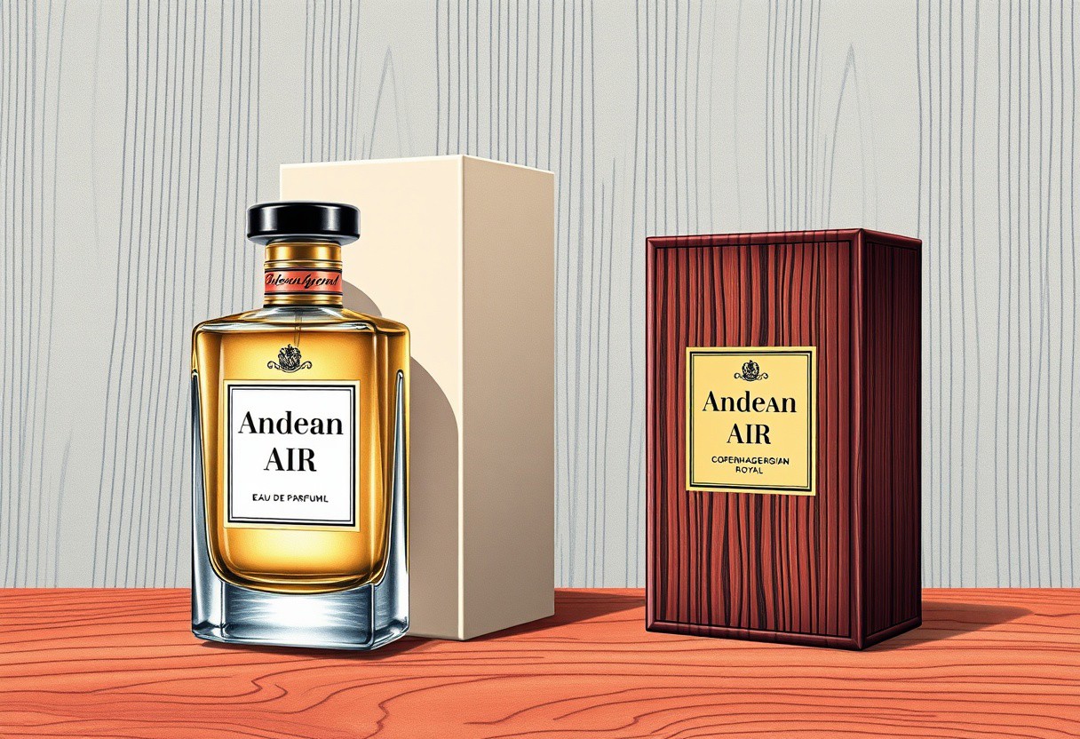 A hyper-detailed illustrator Perfume product poster design, eye-catching, elegant Bottle and Box, Name:" Andean Air", Brand: "COPENHAGEN ROYAL", "300 year Professional", " Eau De Perfume". Apply 60-30-10 rule: 60% primary color: Warm Cream, Soft Light Wood 30% secondary color: Charcoal Gray, Rich Mahogany 10% accent color: Dusty Coral, Matte Black, Burnt Orange