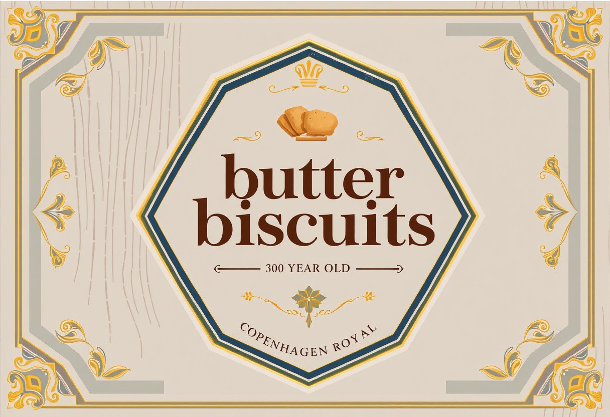 A hyper-detailed illustrator product cover design, eye-catching, elegant, Hexagonal Box, Text:" butter biscuits", Brand: "COPENHAGEN ROYAL", "300 year old". Apply 60-30-10 rule: 60% primary color as light wood and earthy tone, 30% secondary color as light grey, 10% decoration color as mustard yellow, navy blue.