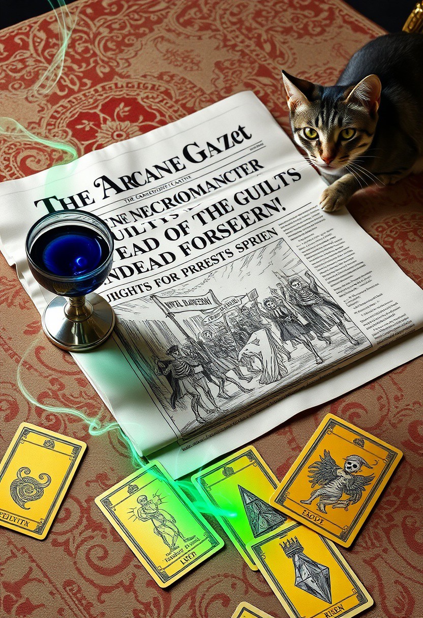 A richly embroidered tablecloth, covered in celestial patterns, cradles a crisp edition of The Arcane Gazette, its front-page headline flashing with urgent enchantment: aROYAL NECROMANCER FOUND GUILTY OF SOUL FORGERY a UNDEAD PROTESTS SPREAD!a Beneath the text, a moving ink sketch shows a cat of skeletal and ghostly citizens marching through the capital, holding banners that read aRIGHTS FOR THE RISEN.a A silver goblet, half-filled with shimmering blue elven wine, rests dangerously close to the edge of the paper, reflecting the dancing words in its surface. Scattered across the table, golden tarot cards lie overturned, their symbols eerily aligning with the chaotic news story. Wisps of green necromantic energy drift lazily from the paperas edges, a sure sign that the article has been cursedaor blessedaby unseen hands. A cat, its eyes gleaming with unnatural intelligence, perches on the back of a chair, occasionally pecking at a loose parchment as if scrutinizing the news. The scent of old books and alchemical ingredients fills the air, mingling with the faint sound of whispered spells still lingering in the room. Outside, the sound of distant chanting can be heardaperhaps the very undead protesters making their voices known beyond the printed word. , detailed background Fantastic lighting. Detailed shadows.intricate details, vivid colors, hyper-detailed, ultra-sharp,