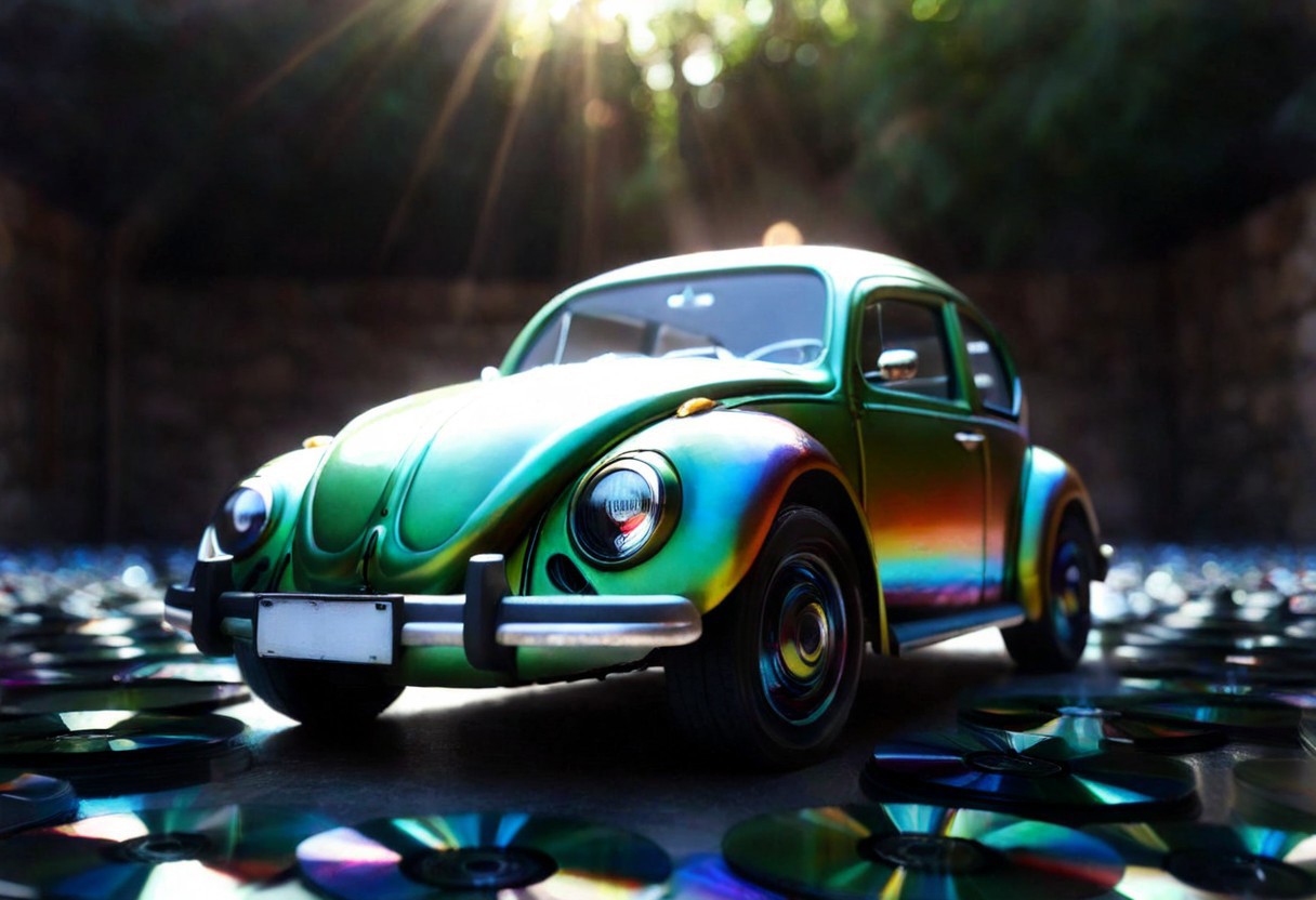 60s Volkswagen Beetle of cd's, light particles, bokeh, looking at viewer , depth of field, masterpiece, colorful, vibrant, dynamic angle, realistic, dramatic light, highly detailed, score_9, score_8_up, score_7_up,