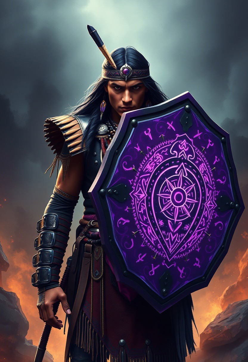 Mysterious native American tribal man with vest armor and long black hair, standing resolute in a defensive pose, with an epic shield that shimmers and glows with an otherworldly aura, its surface comprised of intricate, magical, and colorful purple symbols, reminiscent of the dreamlike artistry of Roger Dean and the vibrant colors of Syd Mead, set against a dramatic, cinematic background with deep chiaroscuro contrasts, and rich subsurface scattering, evoking the fantastical, high-fantasy worlds of cover artist, Michael Whelan, in a bold, dynamic, and detailed digital art style with a mix of realism and fantasy elements