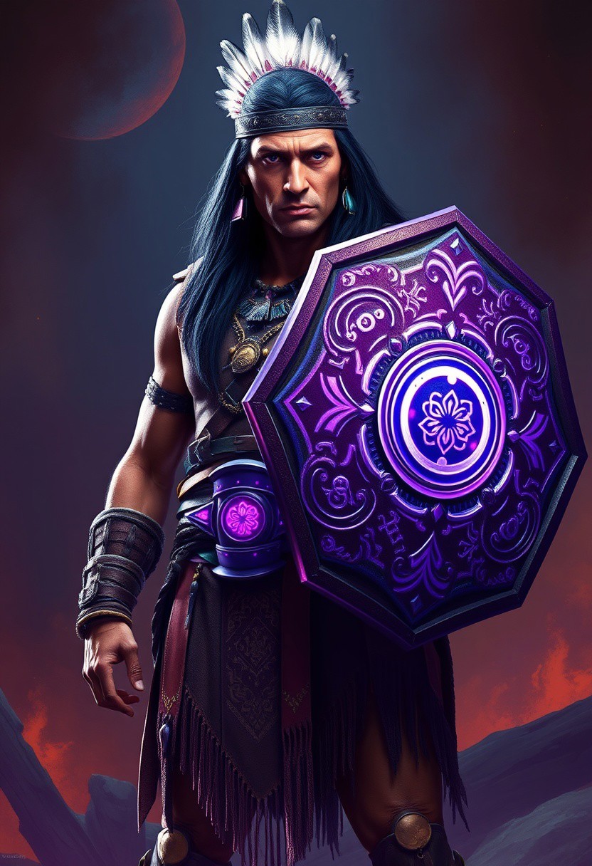 Mysterious native American tribal man with vest armor and long black hair, standing resolute in a defensive pose, with an epic shield that shimmers and glows with an otherworldly aura, its surface comprised of intricate, magical, and colorful purple symbols, reminiscent of the dreamlike artistry of Roger Dean and the vibrant colors of Syd Mead, set against a dramatic, cinematic background with deep chiaroscuro contrasts, and rich subsurface scattering, evoking the fantastical, high-fantasy worlds of cover artist, Michael Whelan, in a bold, dynamic, and detailed digital art style with a mix of realism and fantasy elements
